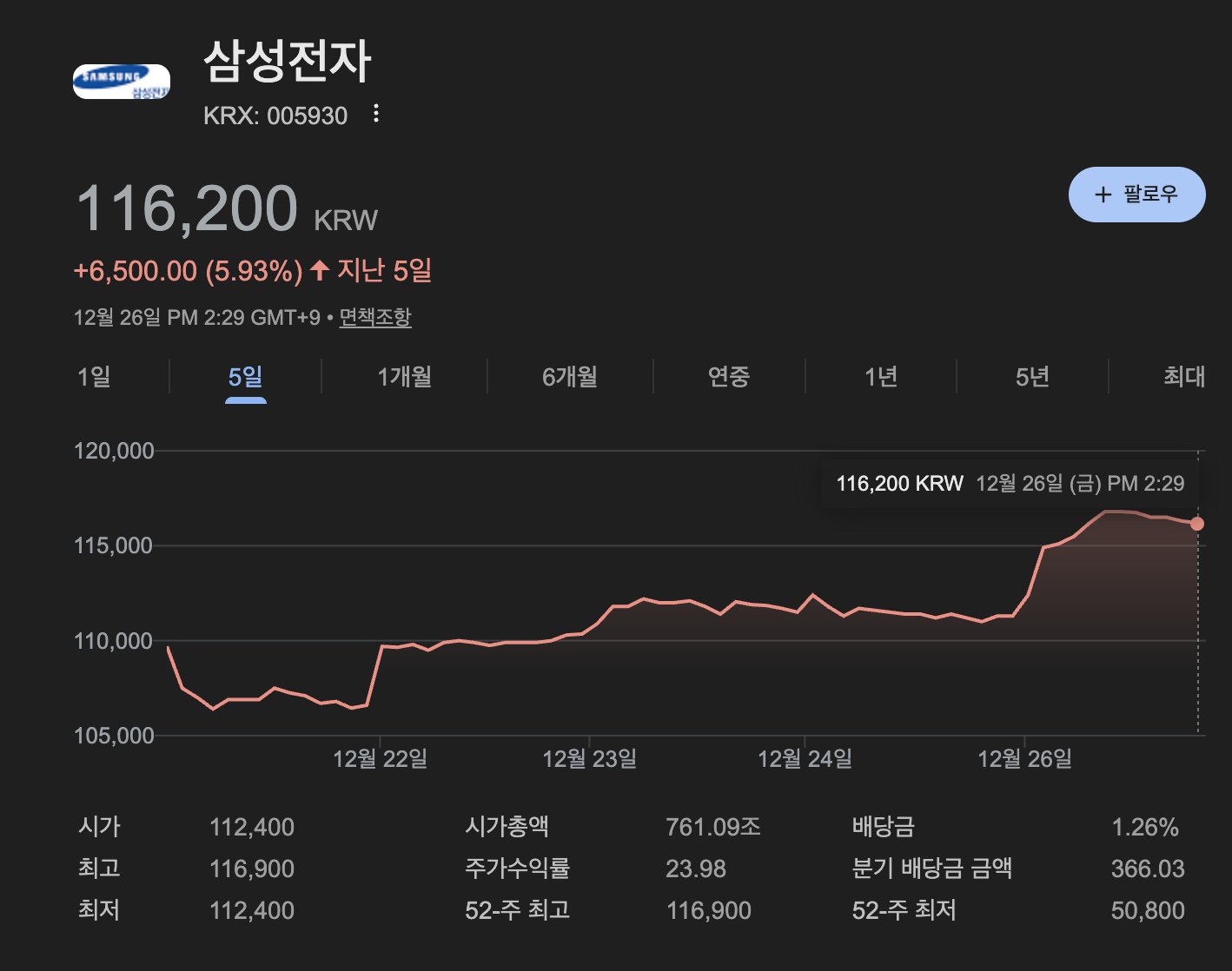| 현재가(가장 최근) | 약 ₩116,000대 |