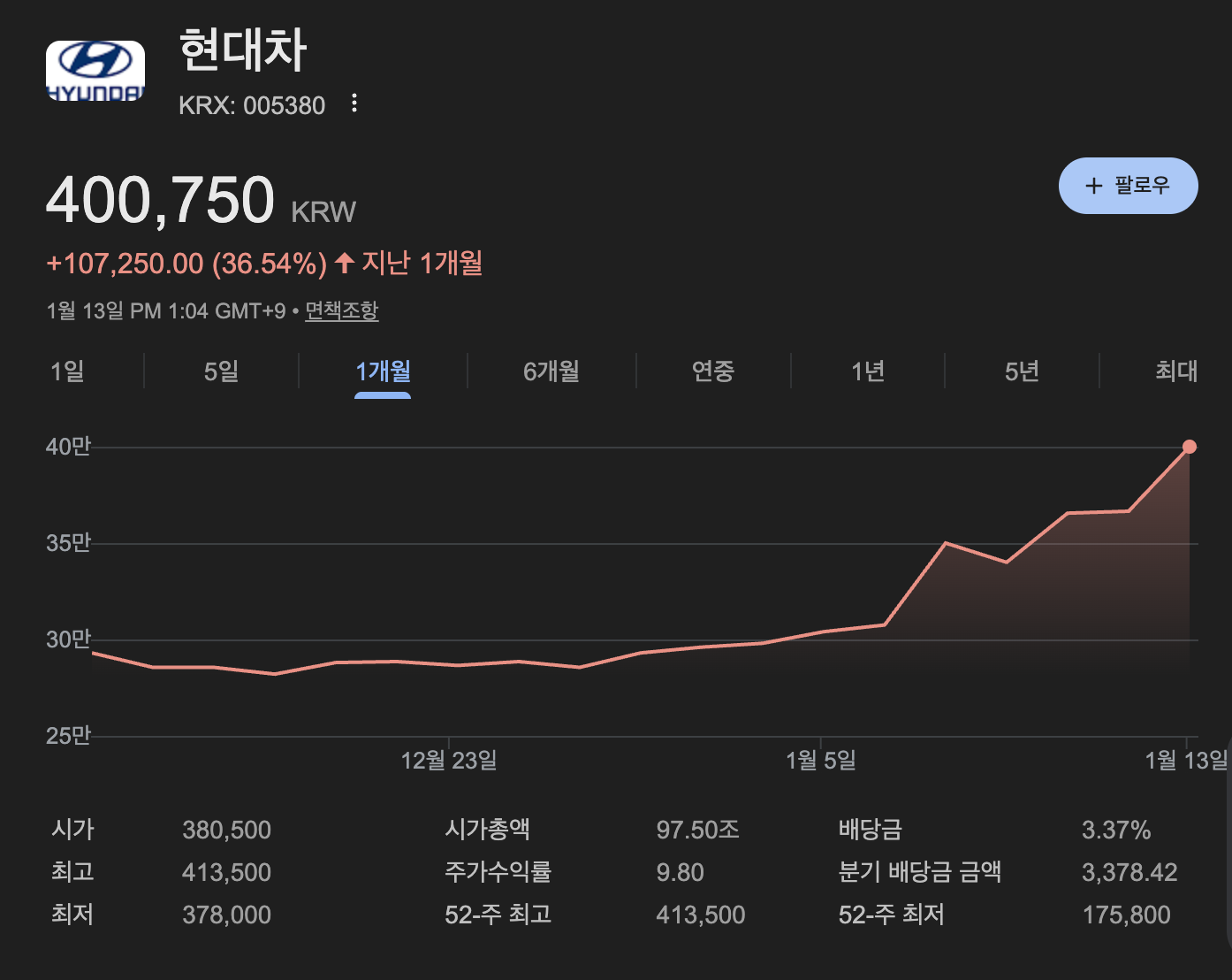 기존 자동차 업종의 흐름을 넘어, AI·로봇·미래 모빌리티 기업으로의 전환 기대감이 주가에 본격적으로 반영되기 시작했다는 평가가 나옵니다.